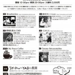 イベント Coffee & Music Vol.6 by syokuyabo|Published 2012年9月10日 開催日:9月22日(土) 開園:12:00 開演:13:00~ チャージ:2000円 ※出演者等詳細に関しては写真をクリックしてください。